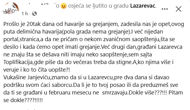„Prošlo je 20tak dana od havarije sa grejanjem, zadesila nas je opet, ovog puta delimična havarija (pola grada nema grejanje). I već nijedan portal, stranica, a da ne pričam o nekom zvaničnom saopštenju, šta se desilo i kada ćemo opet imati grejanje. Već drugi dan, građani Lazarevca ne znaju šta se dešava niti imaju neko saopštenje, sem sajta Toplifikacije, gde piše da do večeras treba da stigne. A ko njima više i veruje i ko to čita uopšte?!“