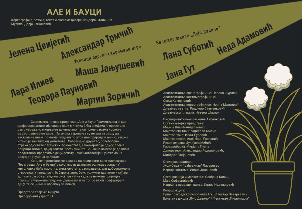 „Ale i bauci“ je plesna predstava namenjena deci uzrasta 6+, koja se bavi slovenskim mitskim bićima i njihovom zaboravljenom ulogom u savremenom svetu. Polazeći od ideje da su mitska bića vremenom svedena na sredstva za zastrašivanje dece, predstava podseća na njihovu prvobitnu svrhu – upozorenje, zaštitu i očuvanje prirode i njenih zakona.
