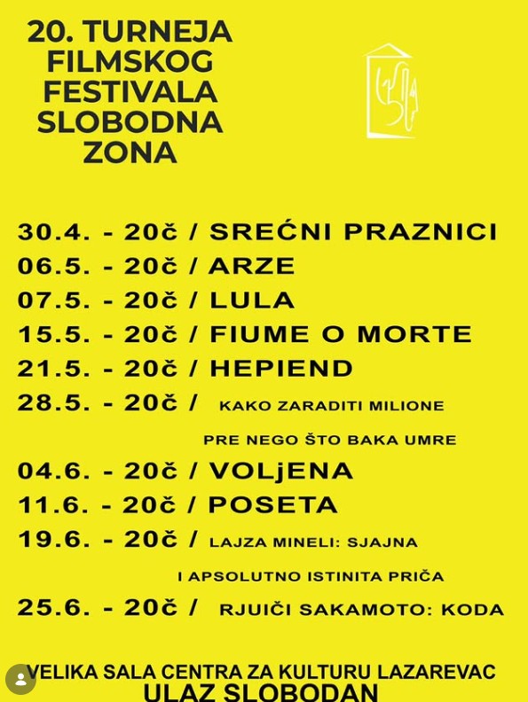 Ljubitelji kinematografije u Lazarevcu biće u prilici da u narednim nedeljama uživaju u bogatom filmskom programu koji u bioskop Centra za kulturu donosi festival „Slobodna zona“. Organizatori su najavili ukupno deset projekcija koje će za sve posetioce biti potpuno besplatne.