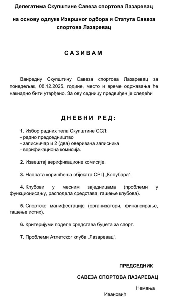 Nakon višenedeljnog ćutanja, predsednik Saveza sportova Lazarevac Nemanja Ivanović konačno je odgovorio na inicijativu sportskih klubova i zakazao Vanrednu sednicu Skupštine Saveza sportova Lazarevac za ponedeljak, 8. decembar 2025. godine.
