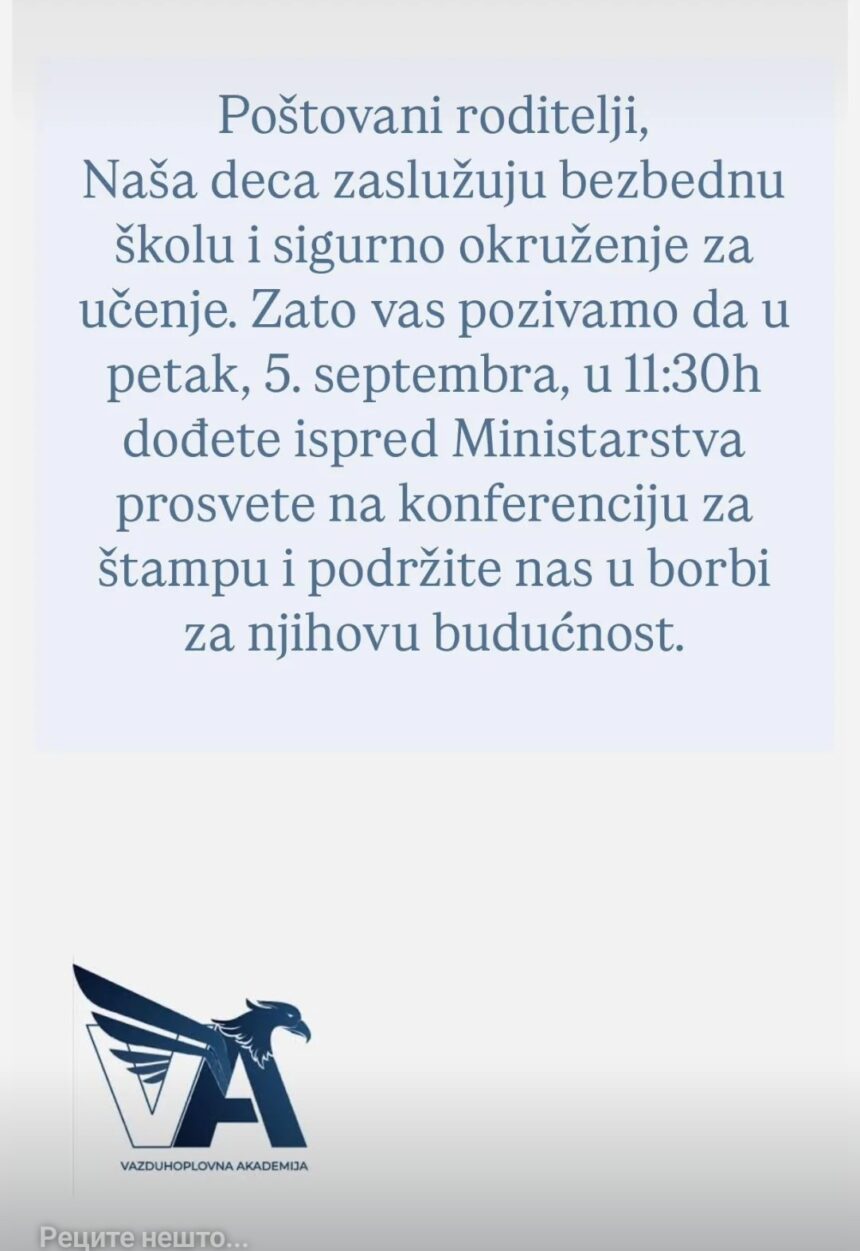 Zaposleni u Vazduhoplovnoj akademiji u Beogradu stupaju u totalnu obustavu rada od petka, 5. septembra 2025. godine, zbog, kako navode, nezakonitih odluka Ministarstva prosvete i Sektora za inspekcijske poslove. Ova odluka doneta je na sastanku održanom 4. septembra, nakon što su procenjeni rizici za buduće funkcionisanje škole. Glavni zahtevi zaposlenih su da Vlada Republike Srbije stavi van snage Zaključak kojim se reguliše pravo korišćenja imovine škole i da ministar prosvete imenuje direktora u skladu sa zakonom, mišljenjem Nastavničkog veća i odlukom Školskog odbora.